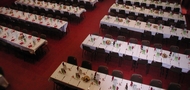 Une vaisselle de qualité pour 650 convives est disponible, avec 4 tailles d’assiettes, 3 tailles de verres et deux jeux de couverts. Voir la liste de la vaisselle et du mobilier.